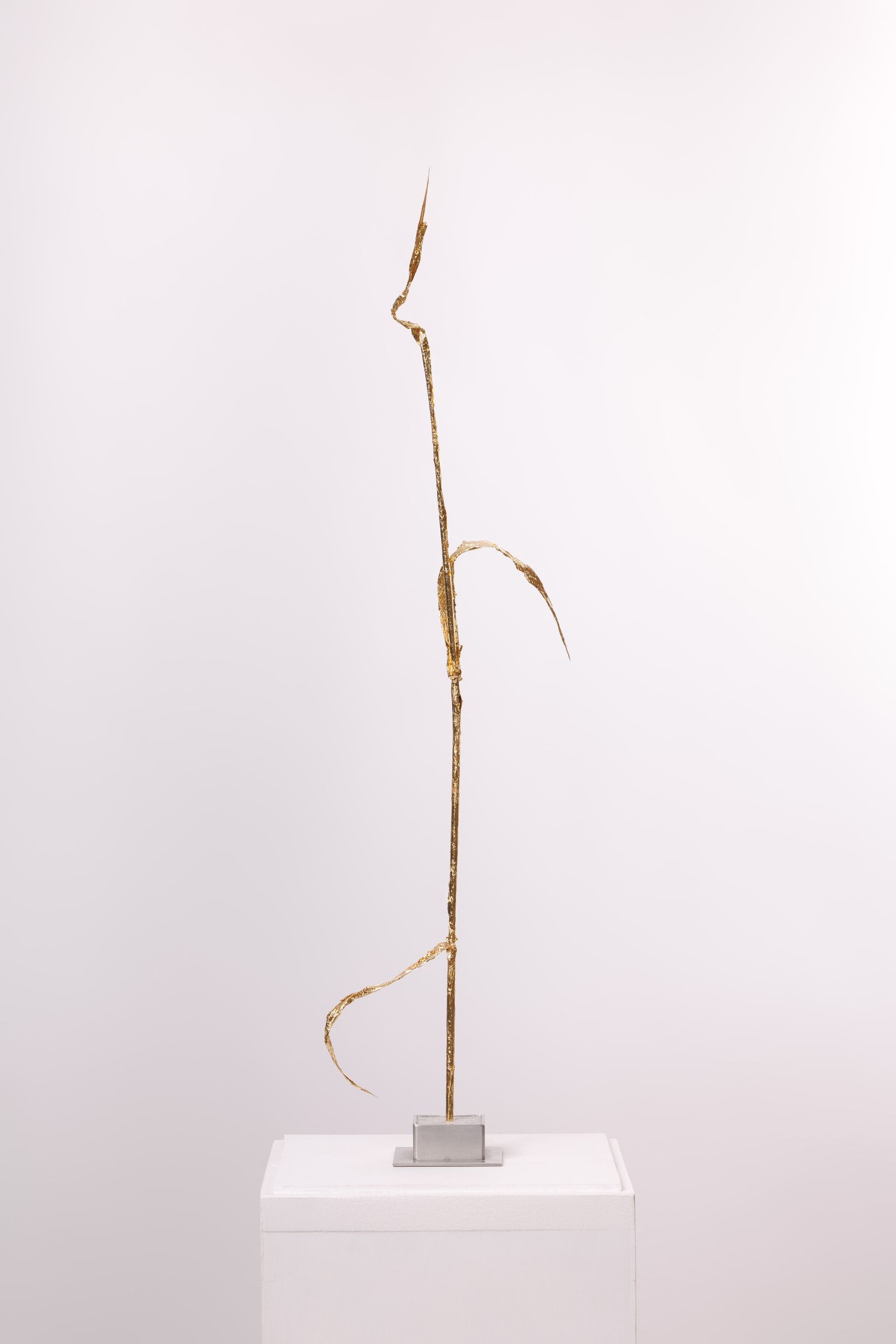Die Besucherinnen und Besucher erwartet eine überwältigende Skulptur aus Stroh. Wer genau hinschaut, erkennt einzelne goldene Halme. Stroh ist ein weitgehend wertloses Nebenprodukt aus der Landwirtschaft. Gleichzeitig präsentieren sich Teile der Installation von Regina Hellwig-Schmid als eines der wertvollsten und begehrenswertesten Materialien – Gold. Während die Krisen und Kriege rund um den Erdball bedrohlich näher rücken, schießt der Goldpreis durch die Decke. Doch was macht seinen Wert aus? Was ist wertvoll? Hat nicht König Midas im antiken Epos die Ambivalenz des Goldes eindrucksvoll vorgeführt? Oder Rumpelstilzchen im Grimm’schen Märchen?
