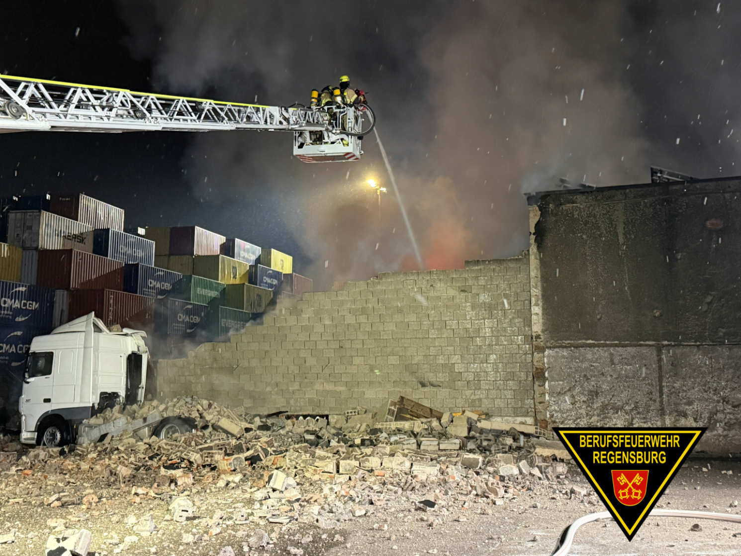 Nachdem ausreichend Kräfte und Löschwasser zur Verfügung waren, konnten die Löscharbeiten, deren Fokus zunächst auf der Verhinderung einer Ausbreitung zu den Anbauten lag, auf die betroffene Halle ausgedehnt werden. Der Brand hatte sich inzwischen vollumfänglich auf den betroffenen Gebäudeteil ausgedehnt. Neben den in Folge der Explosionen versagten Bauteilen fiel im Laufe des Einsatzes auch die Dachstruktur in sich zusammen. Dies erschwerte ein Erreichen aller Brandherde, sodass zur Beurteilung der Statik und zum Prüfen einer eventuellen Unterstützung beim Räumen ein Fachberater des Technischen Hilfswerks (THW) Regensburg angefordert wurde. In Folge kam die Fachgruppe Räumen des THW Laaber zum Einsatz und ermöglichte u.a. mit einem Kran das Abtragen von Bauteilen und somit ein Erreichen von Brandherden.