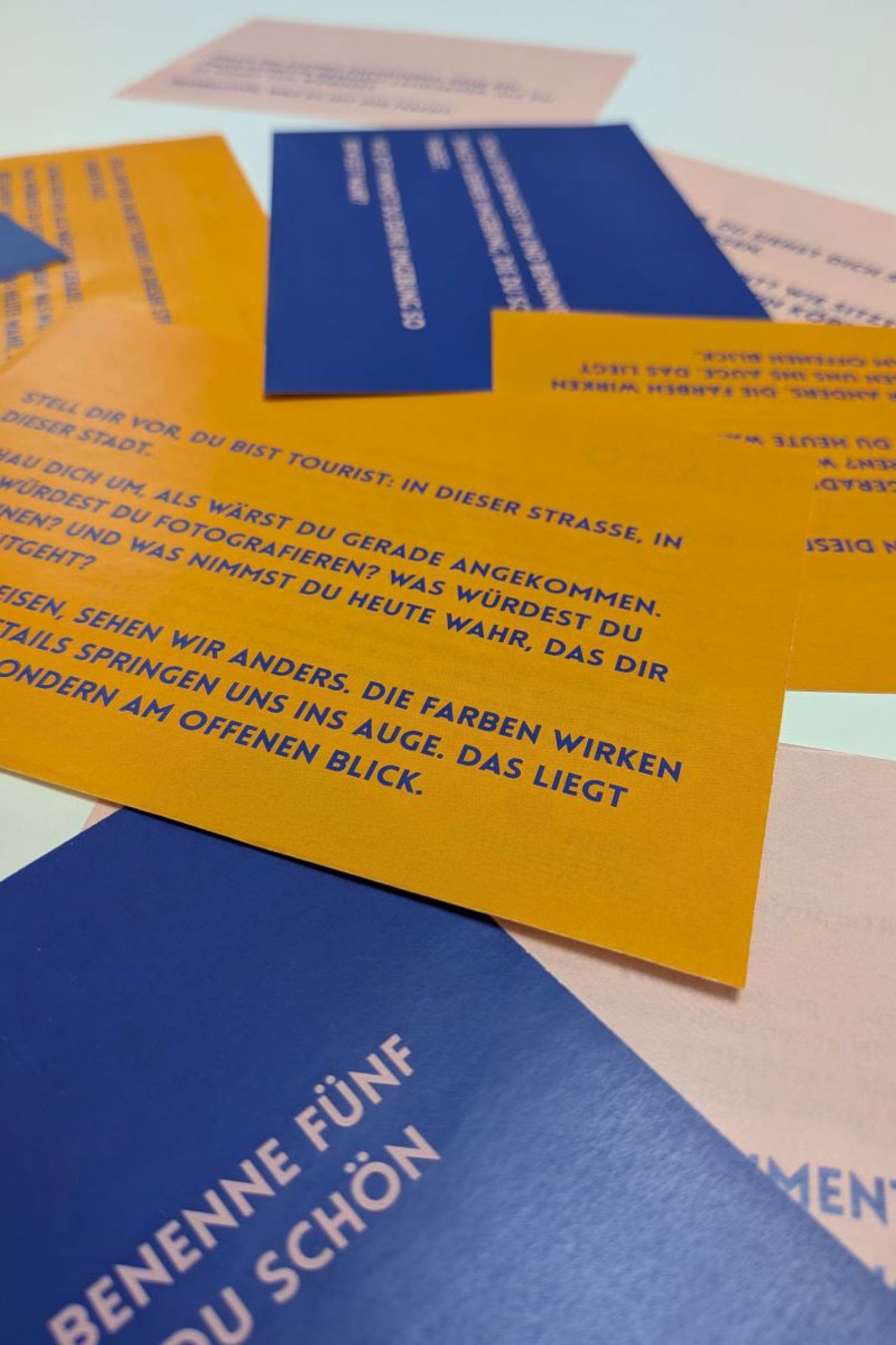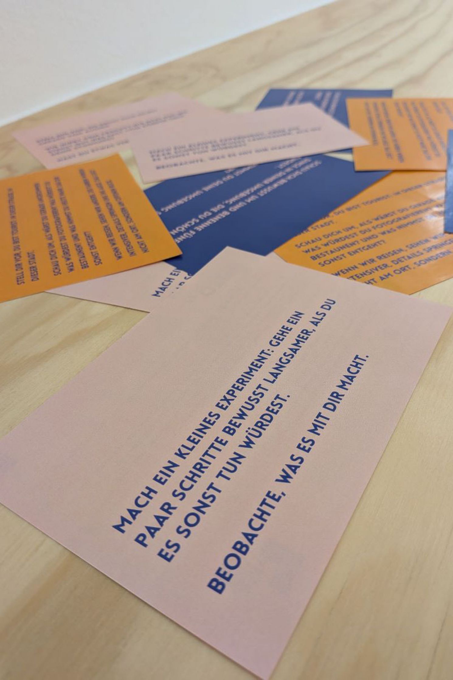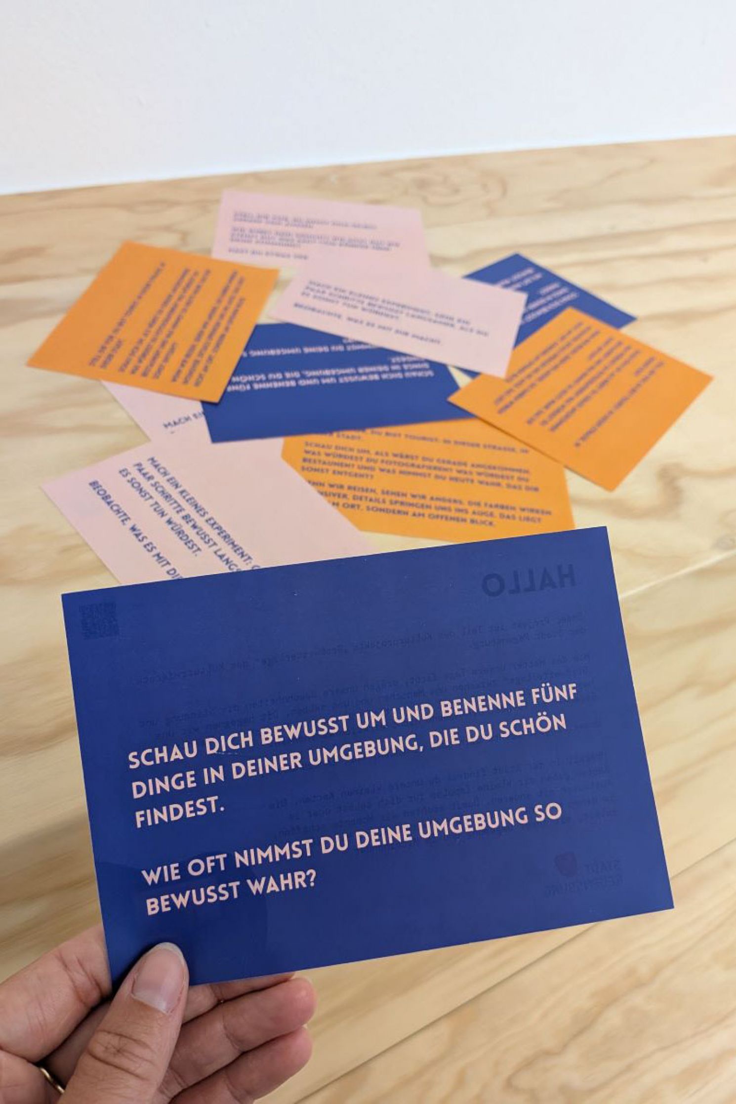 Nach einer kurzen Einführung erhalten die Teilnehmenden gestaltete Karten mit kleinen Aufgaben, Gedanken und Inspirationen. Auf diesen steht zum Beispiel: „Schau dich bewusst um und benenne fünf Dinge in deiner Umgebung, die du schön findest. Wie oft nimmst du deine Umgebung so bewusst wahr?“