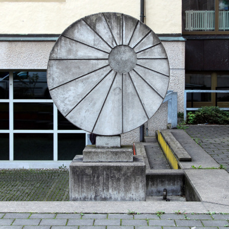 In eine abgestufte Schräge aus Treppen ist ein rechteckiges Becken eingebaut, in welchem kleine Wasserfontänen installiert sind. Daneben findet sich eine Installation aus Sockel und einer aus Beton gegossenen Scheibe. Diese trägt auf der östlichen Seite das Albrecht Altdorfer-Emblem einer Eule und westlich das einer Sonne. Symbolisch stehen diese Zeichen für die Weisheit und das Licht der Erkenntnis.
