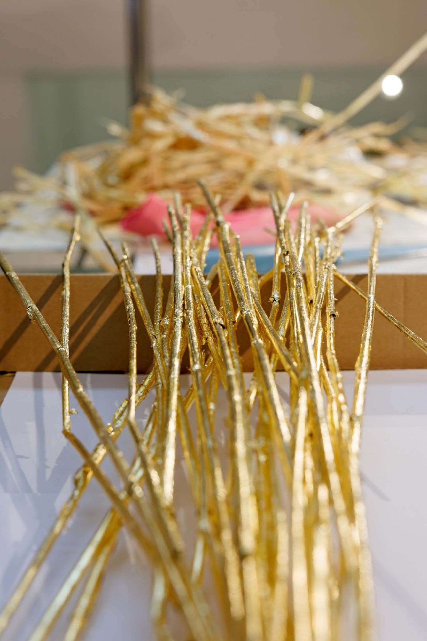 Besucherinnen und Besucher erwartet eine überwältigende Skulptur aus Stroh. Wer genau hinschaut, erkennt einzelne goldene Halme. – Stroh ist ein weitgehend wertloses Nebenprodukt aus der Landwirtschaft. Gleichzeitig präsentieren sich Teile der Installation von Regina Hellwig-Schmid als eines der wertvollsten und begehrenswertesten Materialien – Gold. Während die Krisen und Kriege rund um den Erdball bedrohlich näher rücken, schießt der Goldpreis durch die Decke. Doch was macht seinen Wert aus? Was ist wertvoll? Hat nicht König Midas im antiken Epos die Ambivalenz des Goldes eindrucksvoll vorgeführt? Oder Rumpelstilzchen im Grimm’schen Märchen?