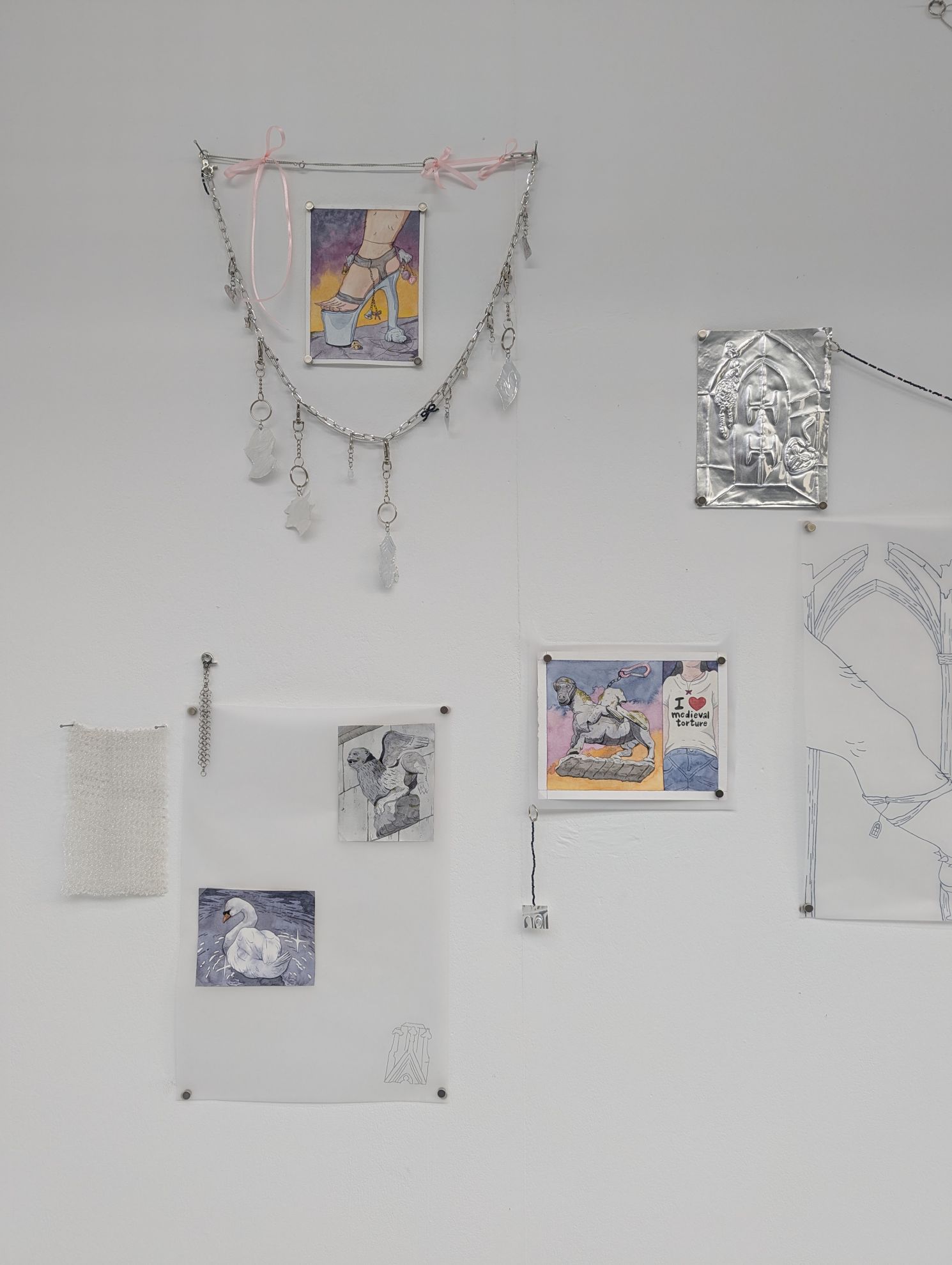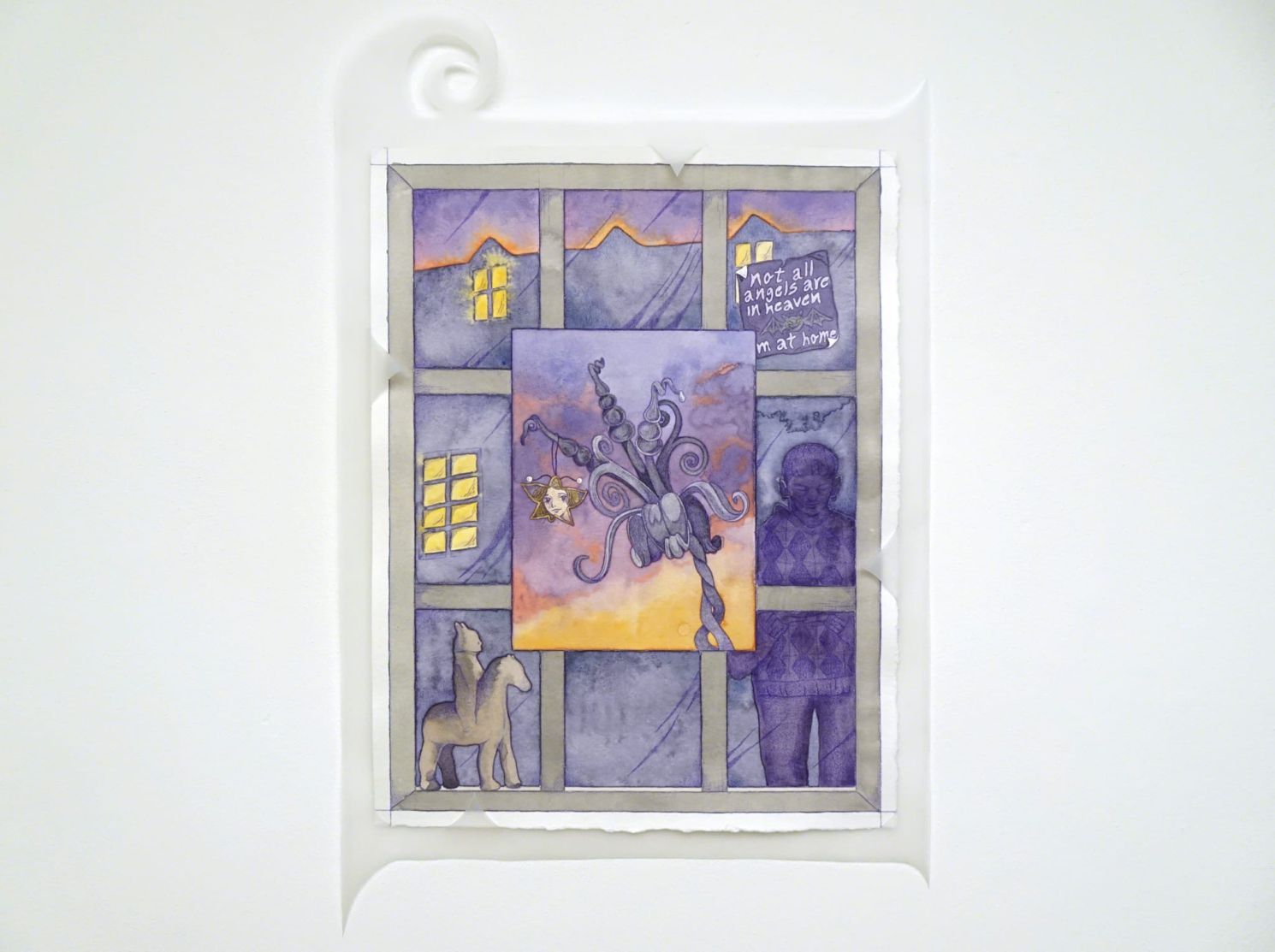 Am Ende seines Aufenthalts präsentierte Víctor seine Zeichnungen und Reliefs im Schaukasten „neunkubikmeter“ in der Pustetpassage. Beeindruckt von der gotischen Tradition in Architektur und Stadtbild, kombinierte der Spanier diese mit Artefakten aus der Popkultur, wie Schlüsselanhänger oder Pokémon. Gepaart mit einer soft-leuchtenden Farbigkeit entstand ein lilafarbener Kosmos in Wasserfarben und Silberprägungen.