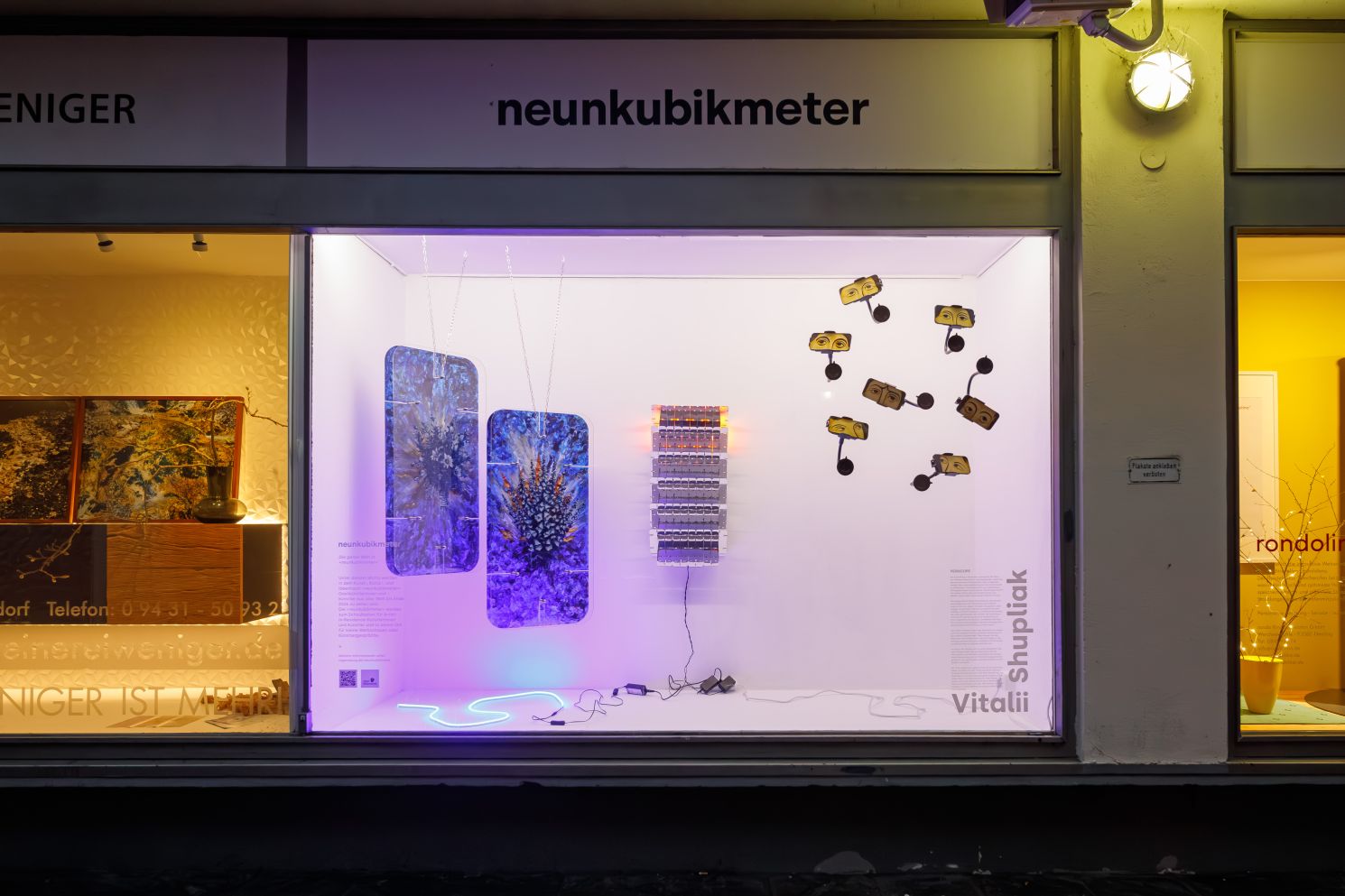 Zum Abschluss seines Aufenthalts in Regensburg präsentiert Shupliak die Ausstellung Periscope in der Schaufenstergalerie "neunkubikmeter". Sein Projekt untersucht den Einfluss sozialer Medien und digitaler Technologien auf unser Verständnis von Realität. Inspiriert durch die Metapher eines Periskops – eines Beobachtungsinstruments, das sowohl Distanz als auch Überwachung suggeriert – stellt die Ausstellung die Spannung zwischen Privatsphäre und Transparenz im digitalen Zeitalter in Frage. Mit einer Kombination aus Hinterglasmalerei und modernen visuellen Elementen thematisiert Shupliak Isolation, Kontrolle und die Manipulation von Informationen und regt die Besucher*innen dazu an, kritisch über ihre Rolle in einer hypervernetzten Gesellschaft nachzudenken.