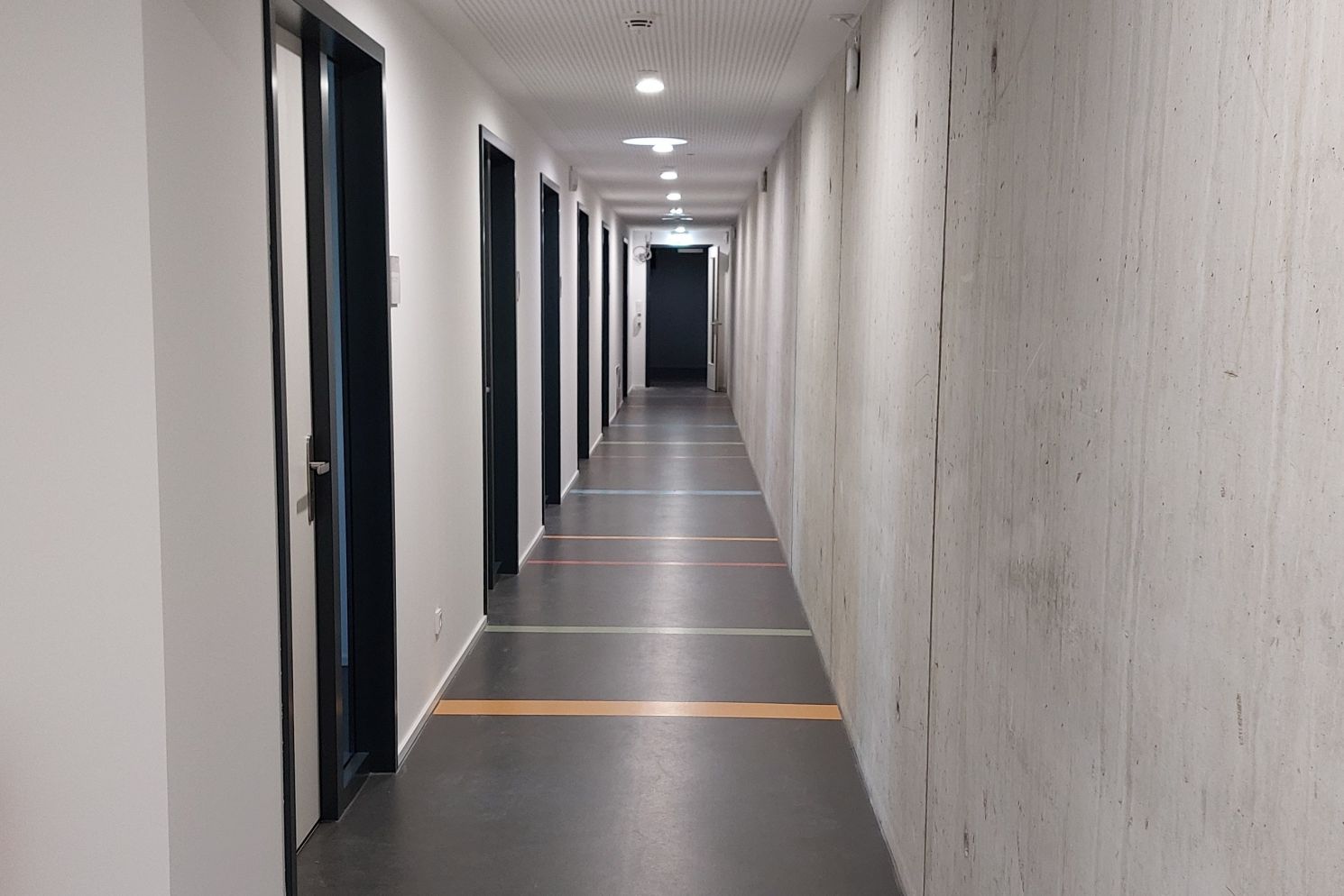 Der Gebäudekomplex besteht aus drei Gebäudeteilen, die durch Erschließungsachsen mit Treppenhaus und Aufzug unterteilt werden.