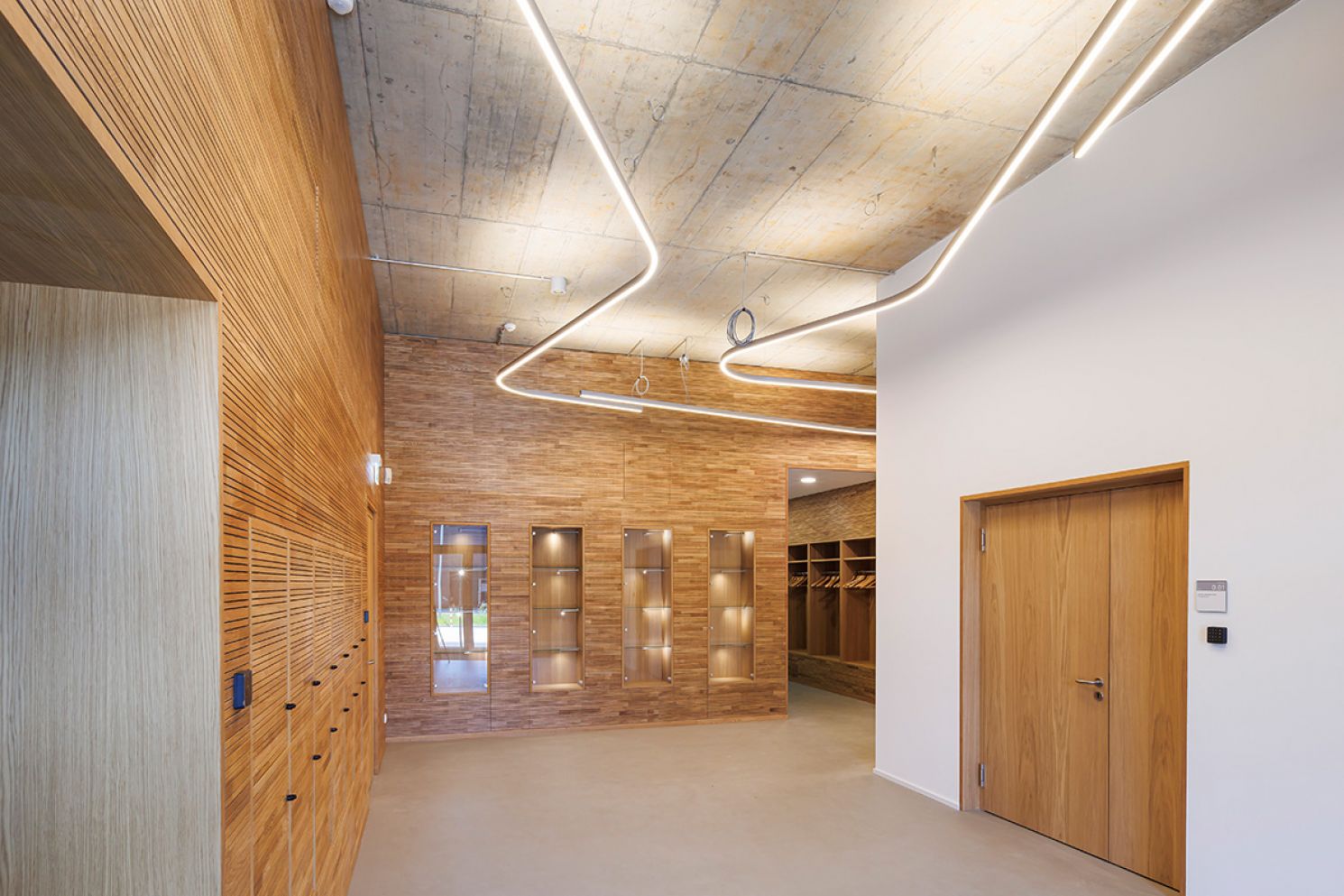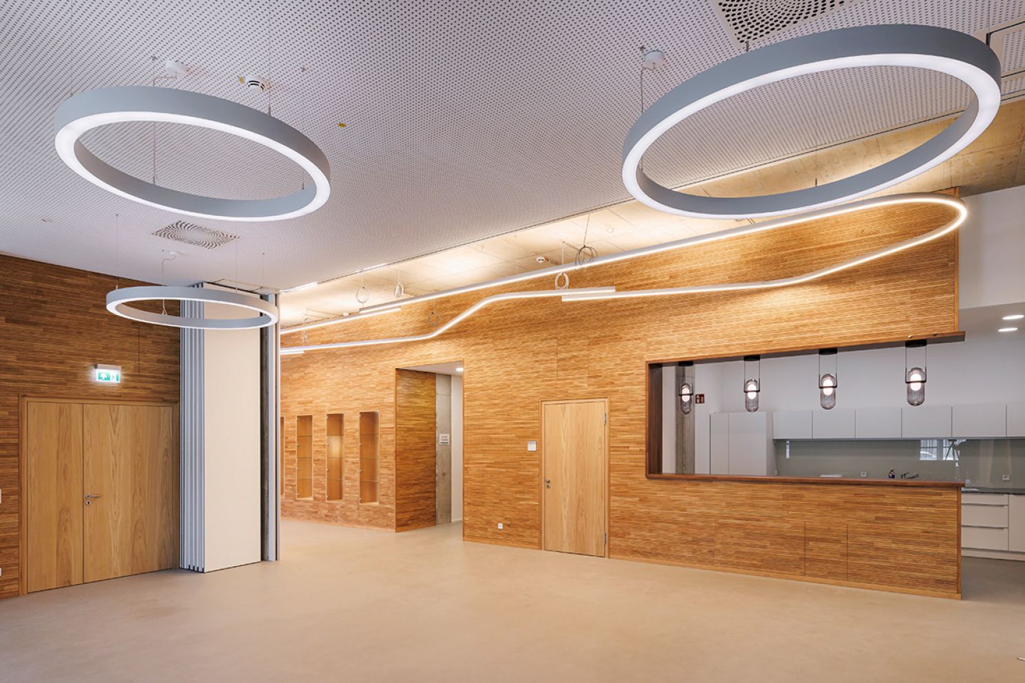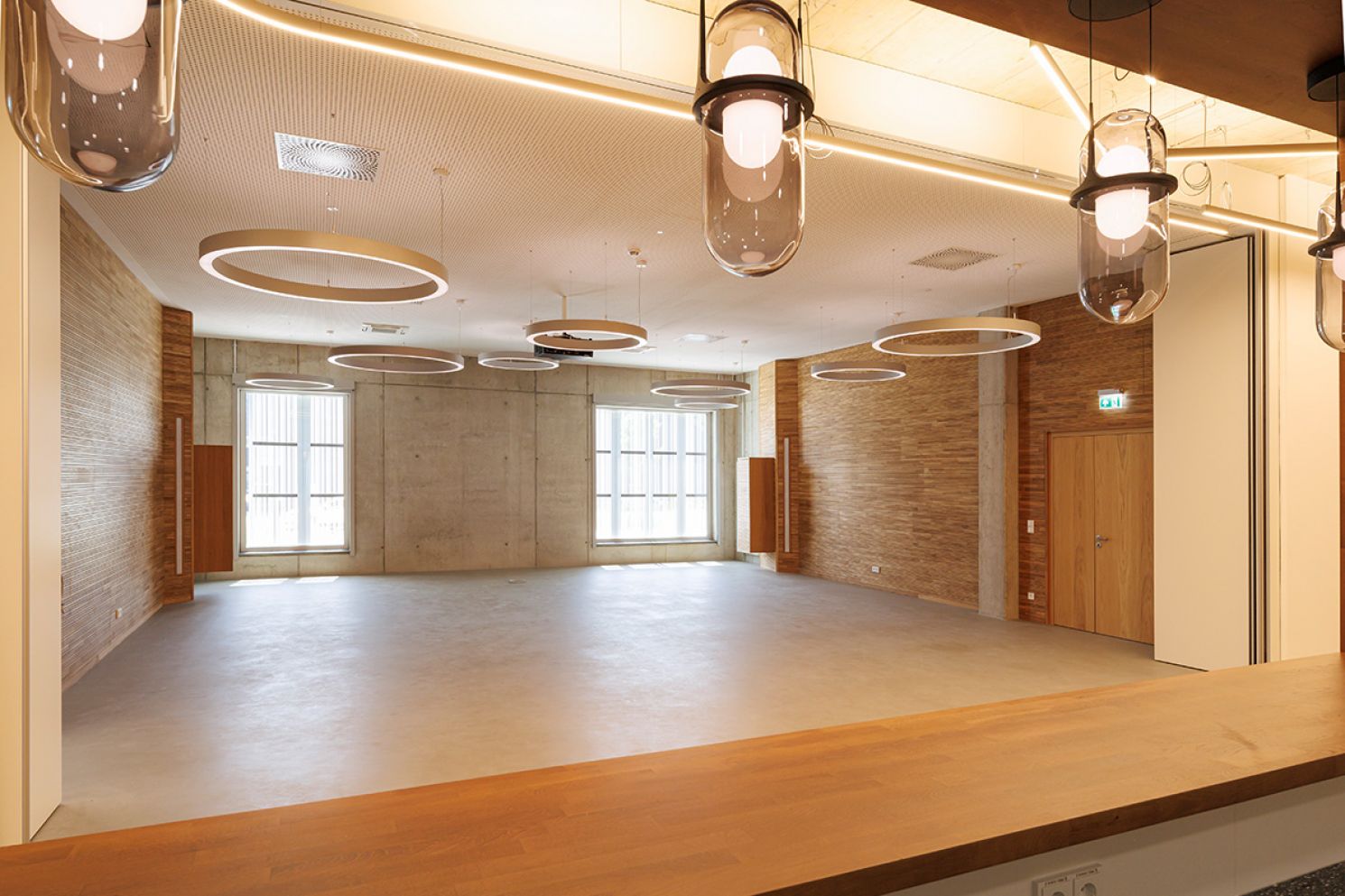 Heizung und Kühlung erfolgen mittels Luft-Wasser-Wärmepumpen in Verbindung mit einem Spitzenlast-Gas-Brennwertkessel sowie einer großflächigen Photovoltaikanlage auf dem begrünten Flachdach.