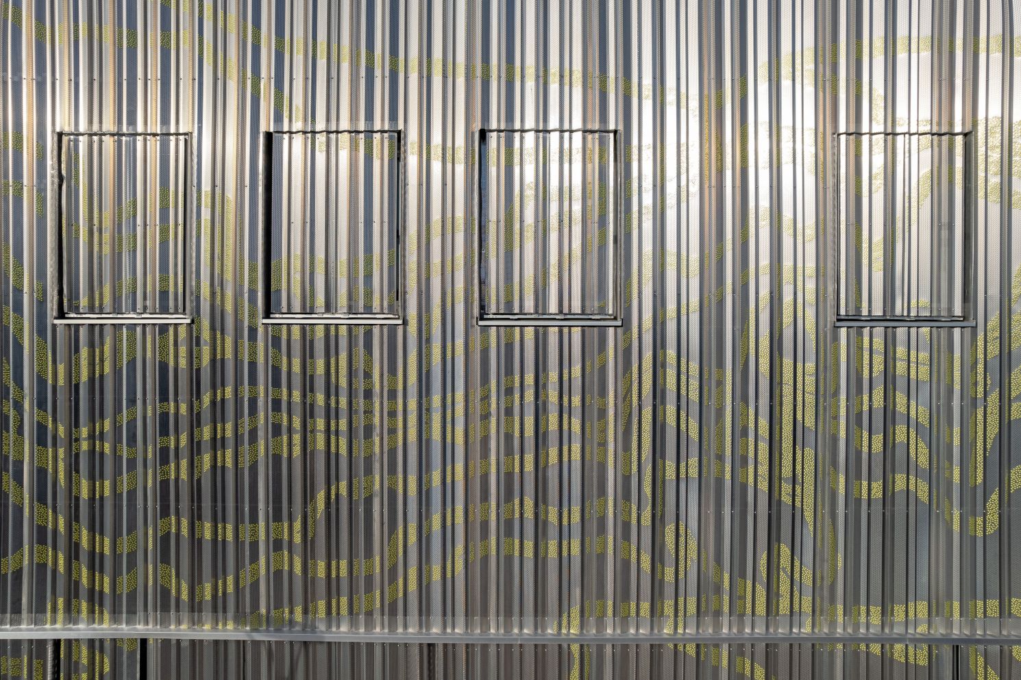 Eine vorgehängte Fassade aus gefaltetem Alu-Lochblech hüllt das Gebäude wie ein metallener Vorhang ein. Die Fassadenöffnungen wurden mit Faltschiebeläden ausgestattet, die mit dem gleichen Alu-Lochblech bekleidet sind.