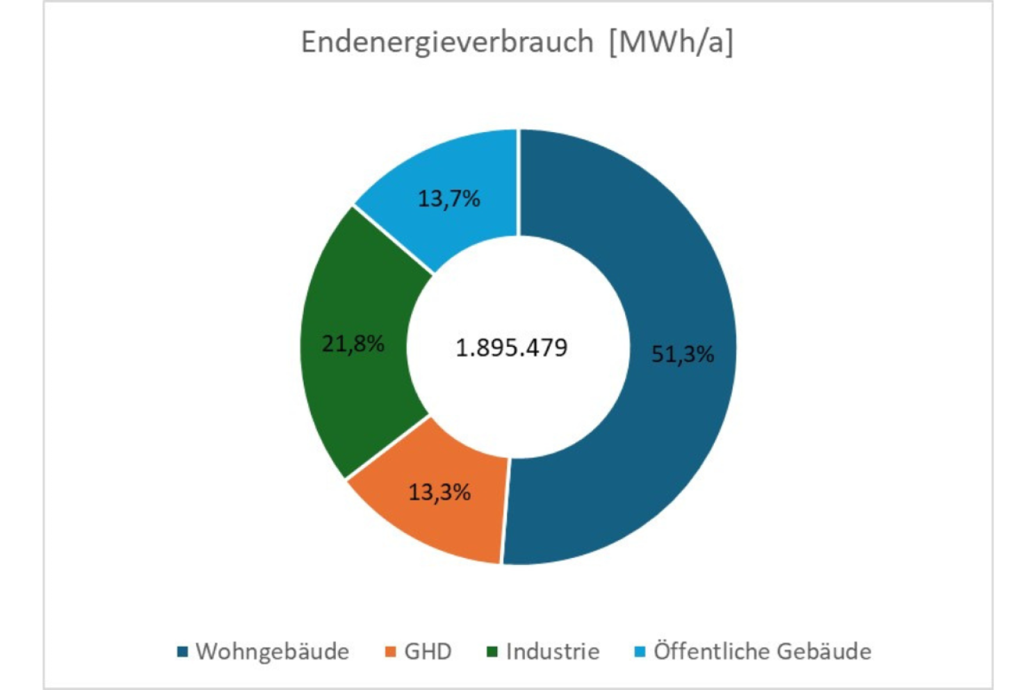 Insgesamt verursacht die Wärmeerzeugung fast 490 Mio. Kilogramm Kohlenstoffdioxid. Der größte Anteil entfällt auf die Wohngebäude, gefolgt von der Industrie, den öffentlichen Gebäuden und dem Gewerbe-, Handel- und Dienstleistungssektor (GHD).