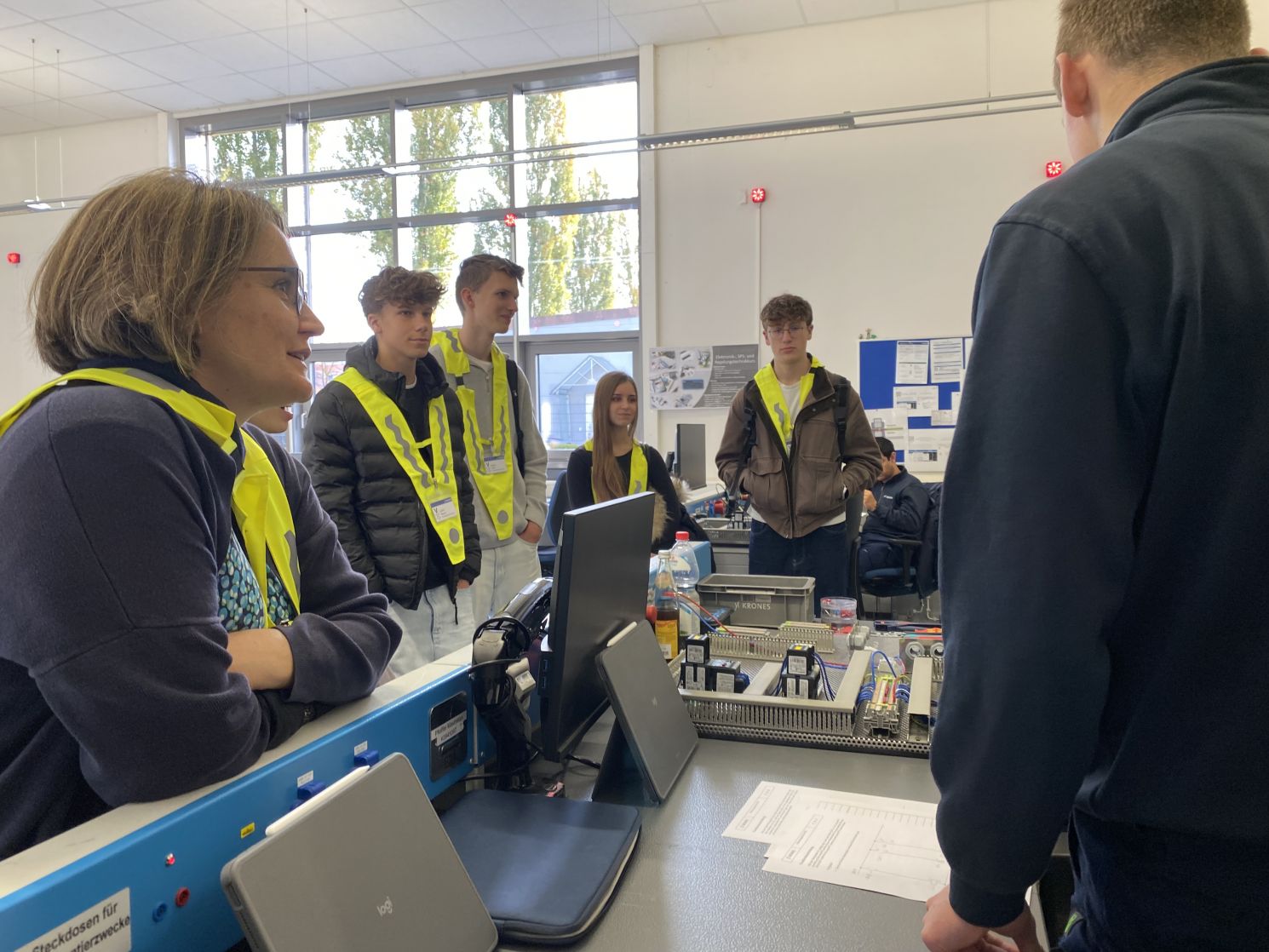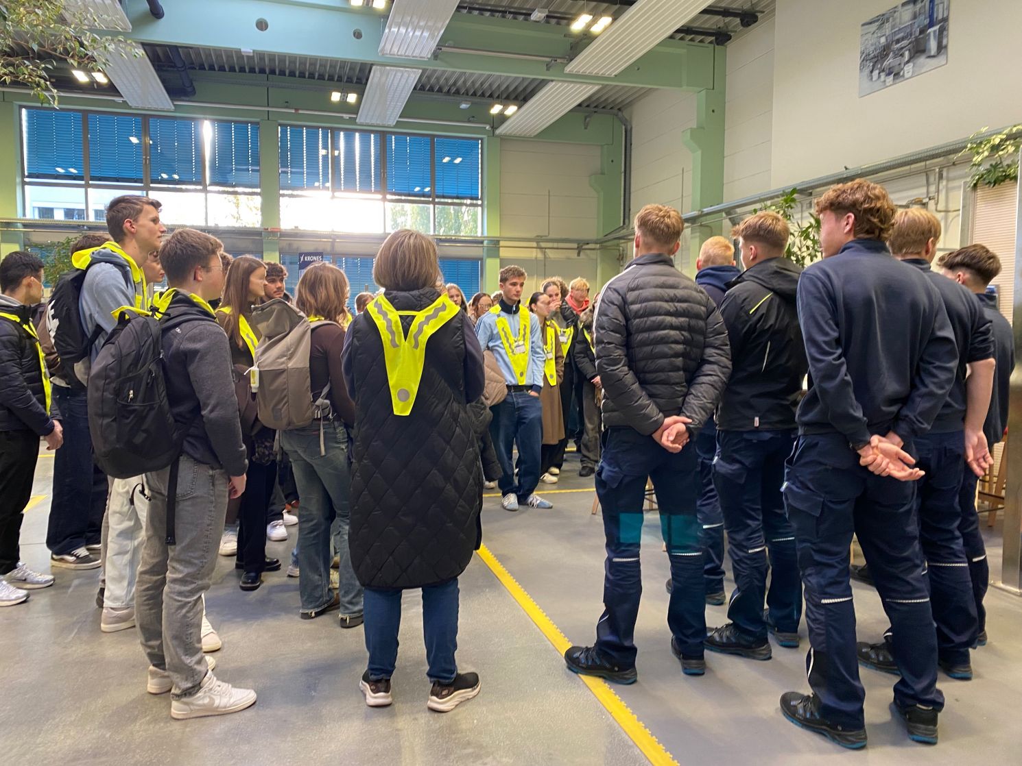 Nach einer Einführung im Ausbildungszentrum, bei der verschiedene Berufe und Ausbildungsmöglichkeiten vorgestellt wurden, ging es für die Gruppe in den Fertigungsbereich. Dort konnten die Schülerinnen und Schüler hautnah erleben, wie komplexe Maschinen entstehen.