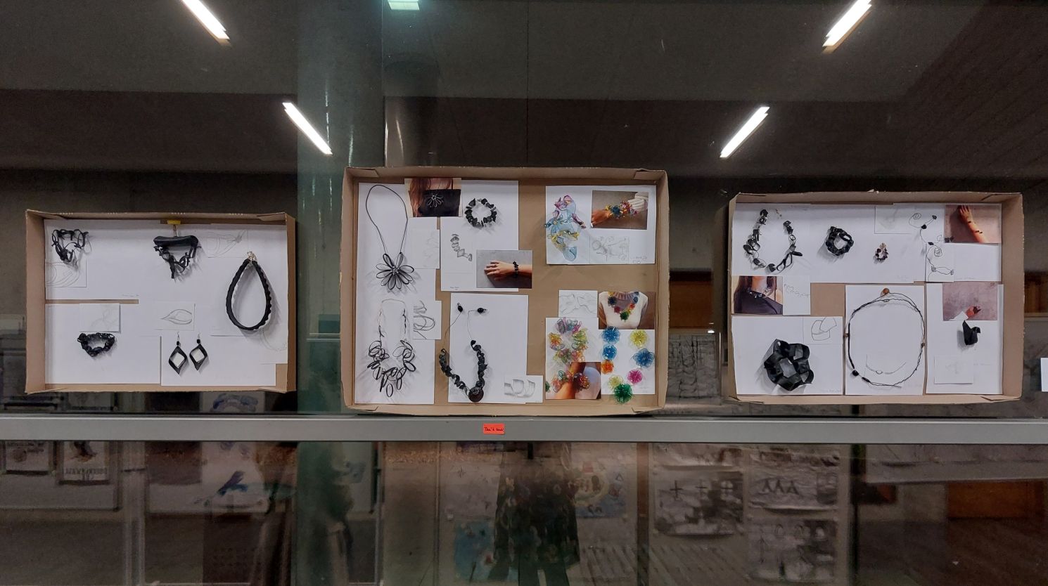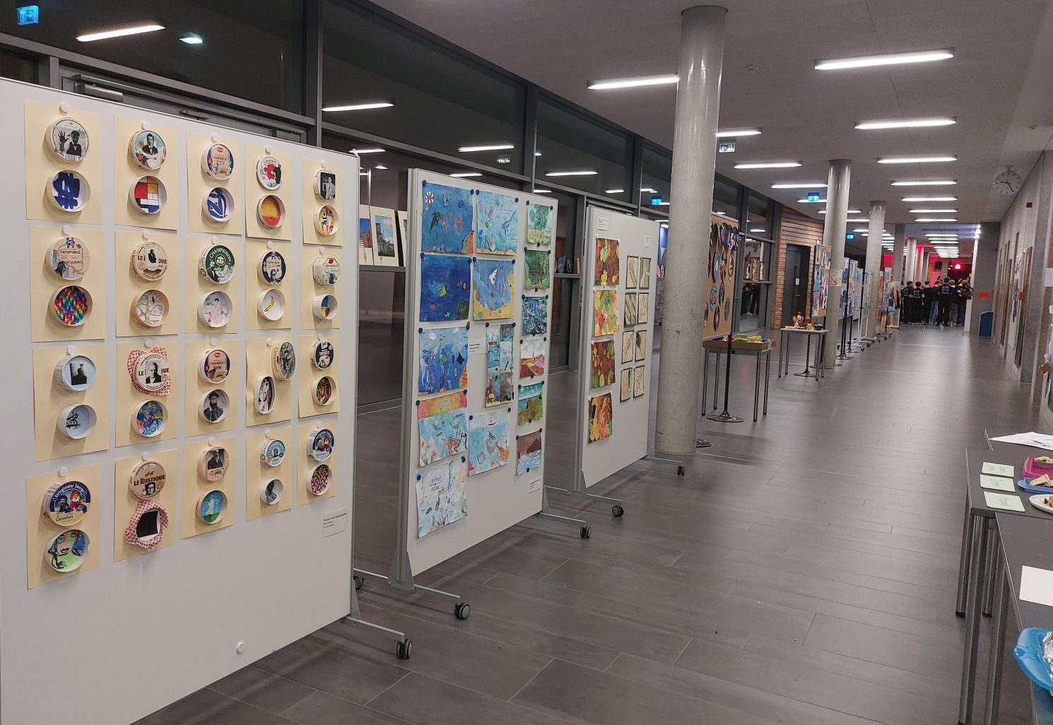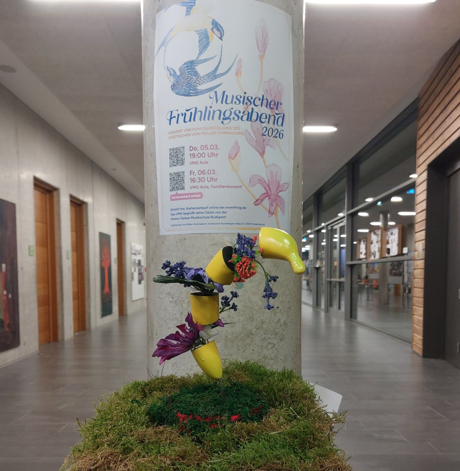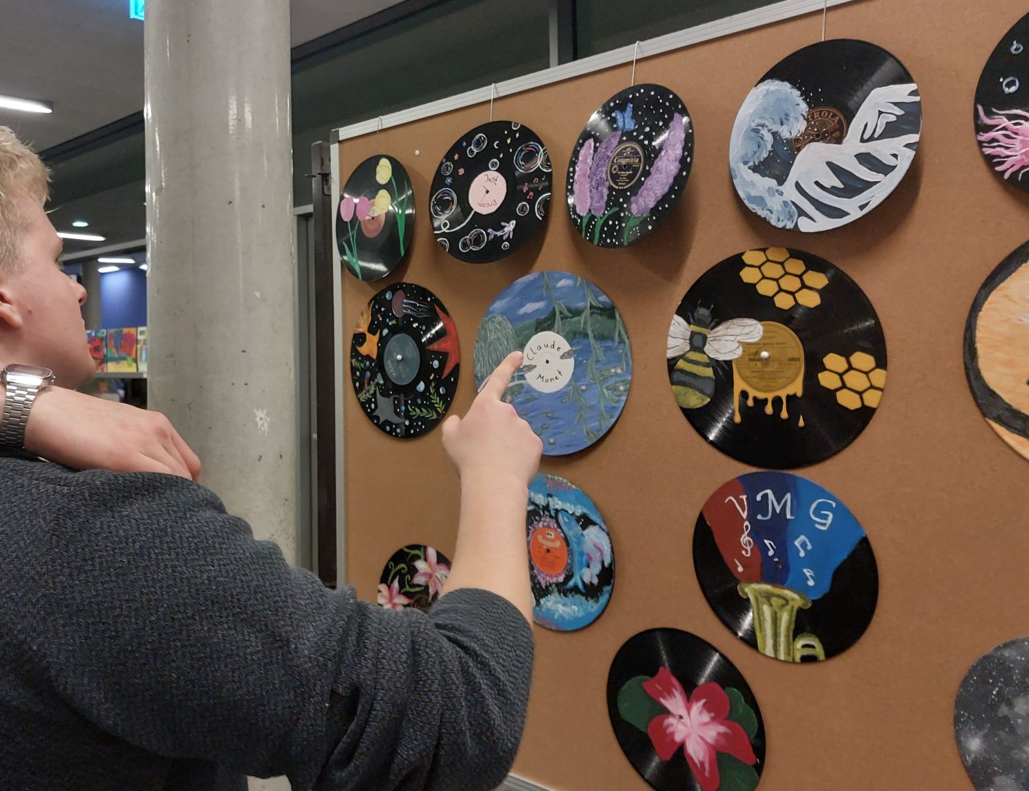 Die exzellenten Exponate der SchülerInnen werden noch bis zum 23.03.2026 ausgestellt sein. Gezeigt werden ausgewählte Arbeiten aus dem diesjährigen Kunstunterricht in den verschiedensten Techniken: Linoldruck, Radierung, Pastellkreide-, Kohle- Bleistift-, Tuschezeichnungen, Acrylmalerei, Aquarell, bis hin zu den verschiedensten Mischtechniken. Einen Eyecatcher bilden bemalte Schellackplatten, die von der Aula bis über die gesamte Ausstellung hinweg zu sehen sind und von der Unterstufe bis zur Oberstufe bemalt wurden. Ideengeber war dabei das P-Seminar Kunst im öffentlichen Raum und mit dem Spender der Platten, Harald Berghoff, konnte die Idee zum Musischen Frühlingsabend umgesetzt werden. Weitere Rauminstallationen sind selbstgenähte, upgecycelte Kleidung sowie Schmuckkästen „bicycle tube jewelry“ mit faszinierend filigranem Schmuck aus Fahrradschläuchen.