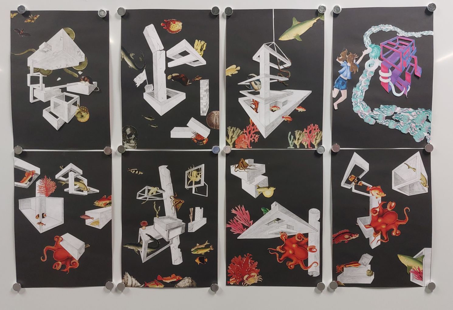 Die Unterstufe zeigt Vortreffliches: Vulkanausbrüche, unbekanntes Meeresgetier, griechische Gefäße, Dschungelbilder, Höhlenmalerei, Winterspaziergänge, fantastische Wasserwelten, den eigenen Namen in der Kavaliersperspektive, Collagen mit den Apokalyptischen Reitern, Fundstücke im Herbstlaub, Zauberlehrlinge und sogar „Entdeckungen neuer Lebensformen“ - alles in allem ein wahrer Augenschmaus. Ebenso punktet die Mittelstufe mit auserlesenen Themen wie spannenden und sauber ausgearbeiteten Übereckansichten von Gebäuden, impressionistischen Landschaften, Bewegungsstudien, wohl komponierten Schlüsseldetails und mit „Mein Zimmer“ in Zentralperspektive. Stufenübergreifend ausgestellt werden auch die Arbeiten (Malerei und Graffiti), die zum diesjährigen Europäischen Wettbewerb eingereicht wurden.