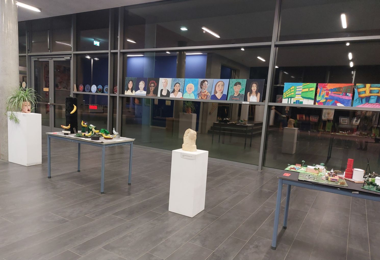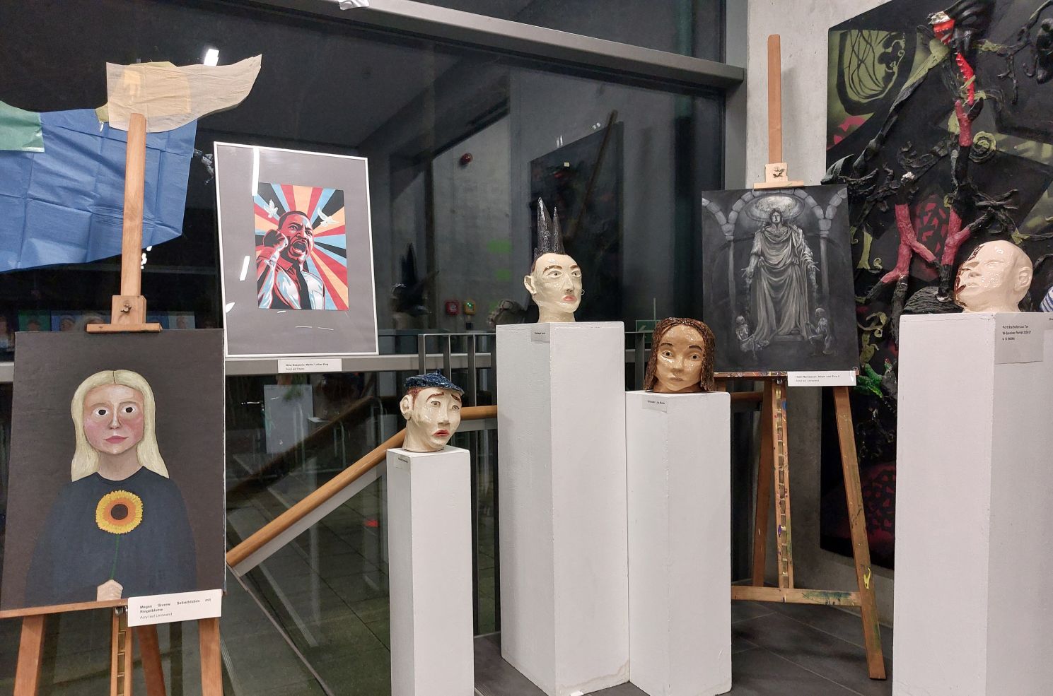 Eine eindrucksvolle Porträtgalerie in Acryl auf Leinwand gestaltete die Q13, die das Wesen der Charakterköpfe künstlerisch sehr überzeugend umsetzte. Ebenso faszinieren Zeichnungen mit dem Thema „Körpererweiterungen“, die uns visionär eine mögliche, prekäre Zukunft vor Augen halten, doch erbauliche, einfühlsame Handzeichnungen nebenan machen dies wieder wett. In der Fotografie ist die Architekturfotografie der Q12 mit erlesenen Detailansichten von Gebäuden in der Nähe vertreten. Von der blühenden bis zur blutenden Banane geht es bei Objekten aus Plastikbananen, die zum Denken anregen und so lautet ein sinnstiftender Titel: „Mirror, mirror on the wall, who is THE BANANA oft them all?“ Individuelles Design aus glasiertem Ton der Q12 befindet sich in der Nähe der W-Seminararbeiten. Hier sind zwei W-Seminare vertreten -Porträt und Menschenbild- die zum Verweilen und Nachdenken einladen: Vom Punkkopf bis zum afrikanischen Maskenkopf sind ergreifende, ausgezeichnete Porträts aus Ton zu begutachten. Zur Reflexion lädt ein männlicher Torso sowie die Leinwandarbeiten „Adam und Eva II“ oder „Sehnsucht und Leid“ ein, bis hin zum eindrucksvollen „Selbstporträt mit Sonnenblume“ nach Paula Modersohn Becker, dem Tiefdruck „Triade der Triebe“ und schwarz-weißen Porträtfotografien. Farbenfroh präsentieren sich „Martin Luther King“, „Gefangen in mir selbst“ nach Elvira Bach und „Vielfarbigkeit der göttlichen Erlösung“.