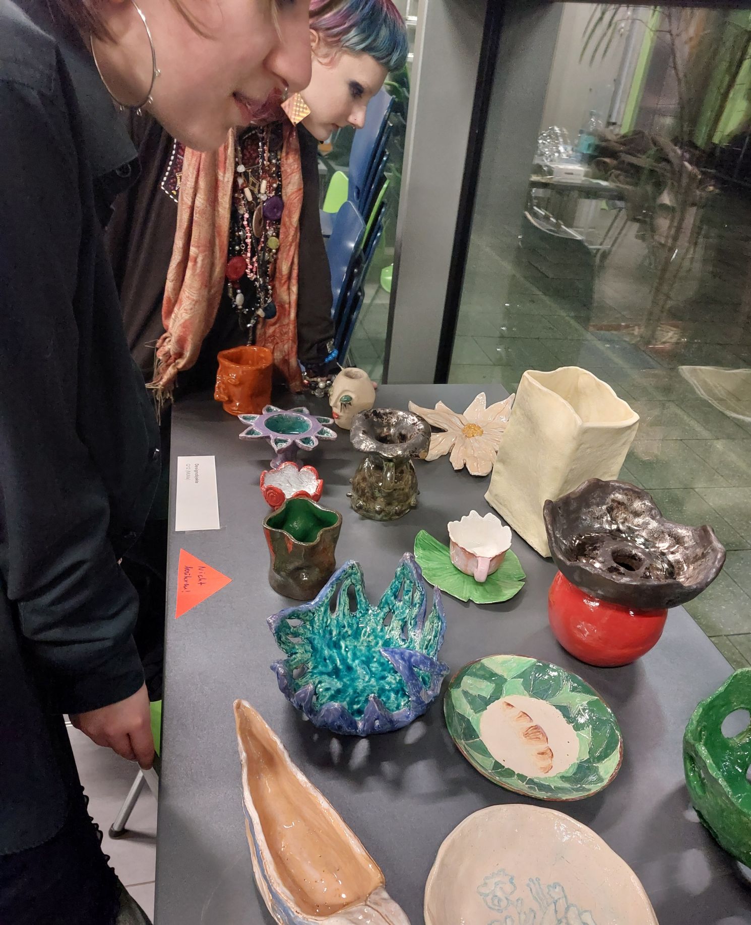 Die Fachschaft Kunst glänzte wieder neben den alljährlichen Arbeiten aus dem Kunstunterricht mit einem variationsreichen, diesmal neuen künstlerischen Repertoire: Von kleinen bunten Ostereierfiguren zu lebensgroßen Porträts aus Ton über knallige, postmoderne Architekturmodelle sowie Kunst in der Käseschachtel bis hin zur Liveperformance und zum Kurzfilm.