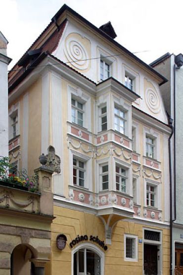 Sog. "Enslinhaus", gotisches Eckhaus mit Kastenerker und Schopfwalm-Mansarddach, Umbau mit Fassadengliederung im Zopfstil Ende 18. Jh.